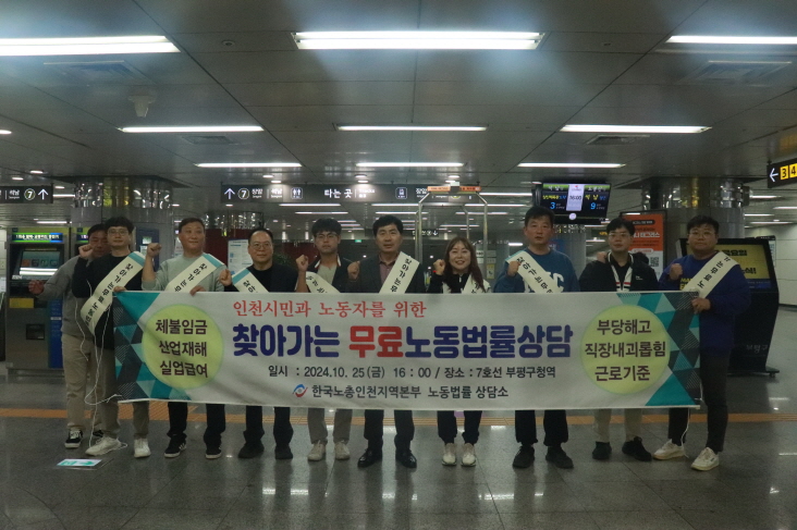 한국노총 인천지역본부(의장 김영국) 10월 25일(금) 16시부터 2시간 동안 인천부평구청역 일대에서 미조직 취약계층 노동자를 위한 찾아가는 무료노동법률상담을 실시 하였다.노동제반과 관련한 상담에서부터 각종 법률상담에 이르기까지 생활 전반 분야에 걸친 다양한 법률적 자문을 지원하는 무료 노동법률상담은 한국노총 인천지역본부에서 실시하며 지역주민들에게 찾아가는 노동서비스를 제공하고 있다.