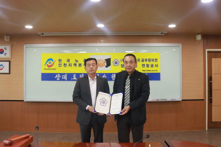 한국노총 인천지역본부(의장 김영국)은 10월 30일(수) 10시에 한국노총 인천지역본부 4층 국제회의실에서 정담의전(대표 명재익)과 업무협약을 체결하였다.